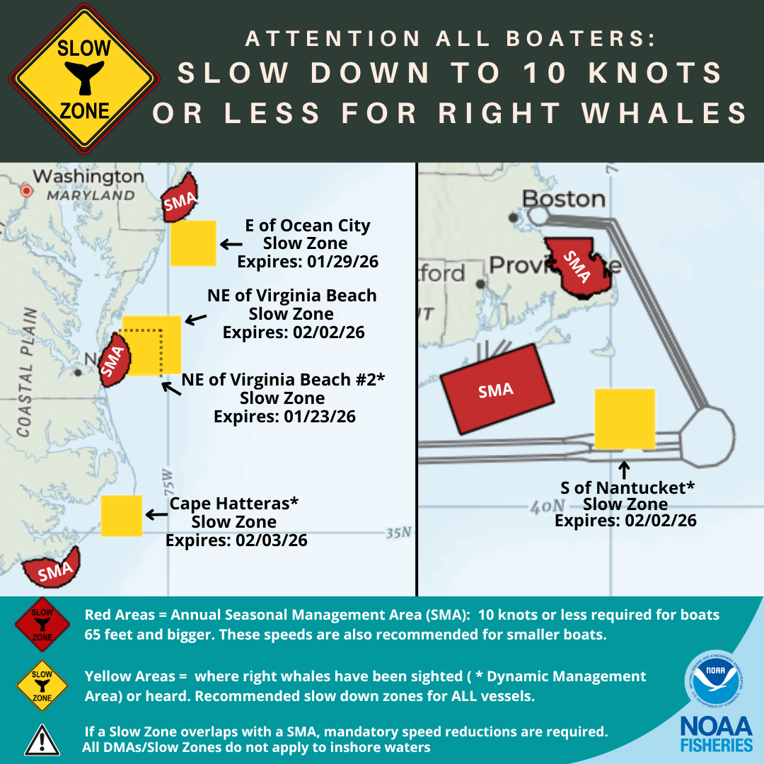 On January 18, 2026, the Cape Charles buoy operated by the Woods Hole Oceanographic Institution and NAVFAC Atlantic redetected the presence of right whales northeast of Virginia Beach, VA. The right whale Slow Zone is in effect through February 2, 2026.