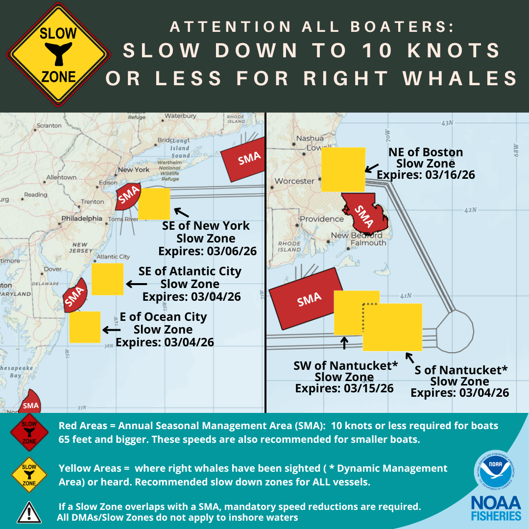 On March 1, 2026, the Cape Ann buoy operated by the Woods Hole Oceanographic Institution detected the presence of right whales northeast of Boston, MA. The right whale Slow Zone is in effect through March 16, 2026.